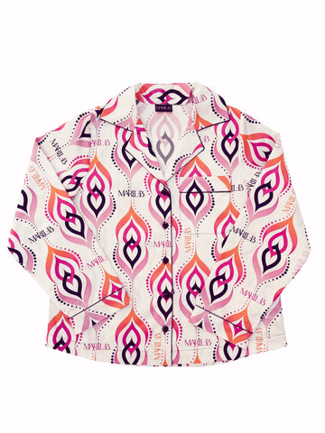 Elevate your loungewear with our stunning Summer Flame Silk blend Pajamas, offering both comfort and refinement. The coordinated set includes a long-sleeved shirt with a flattering fit, crystal button detailing, and a chest pocket with piping for a touch of design.